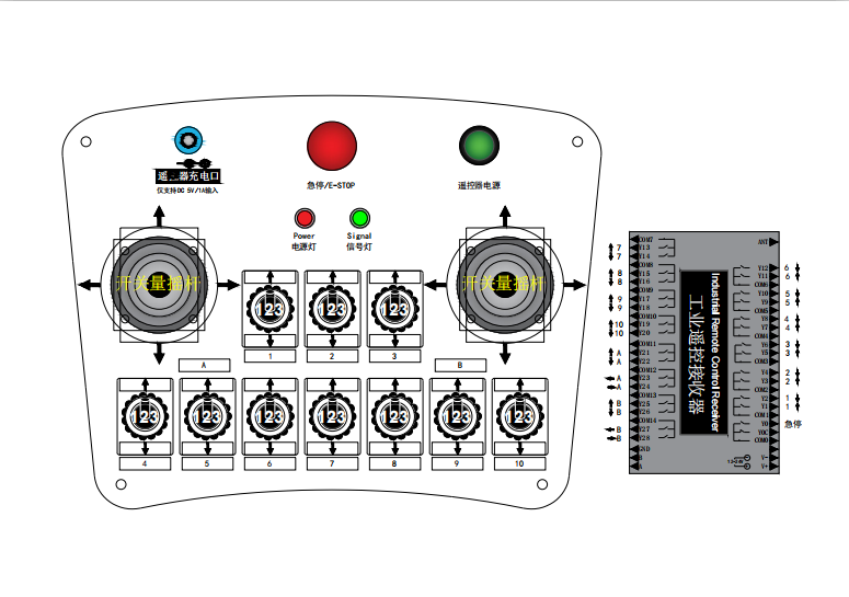 布局配置:3個四方向開關(guān)量自復(fù)位搖桿,10個三位自復(fù)位撥桿,, 2個指示燈,充電孔,及啟動和急停蘑菇頭;