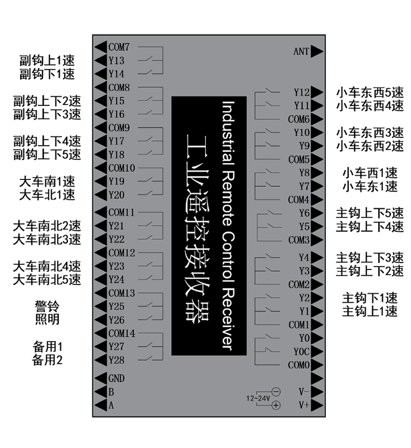 搖桿前后左右推動(dòng)控制吊鉤上下,小車左右,大車前后運(yùn)行,搖桿自復(fù)位模式,且5檔位速度控制,按鍵均為點(diǎn)動(dòng)模式,搖桿前后左右推動(dòng)均實(shí)現(xiàn)5個(gè)檔位速度控制,且每個(gè)搖桿對(duì)應(yīng)的接收器端2速3速4速5速繼電器,前后推動(dòng)時(shí)2速3速4速5速繼電器是共用的,左右推動(dòng)時(shí)2速3速4速5速繼電器是共用的,搖桿四個(gè)方向只有對(duì)應(yīng)的接收器端1速繼電器也就是決定方向的開(kāi)關(guān)量是不共用的,4個(gè)決定方向的開(kāi)關(guān)量繼電器都是單獨(dú)的。 |
